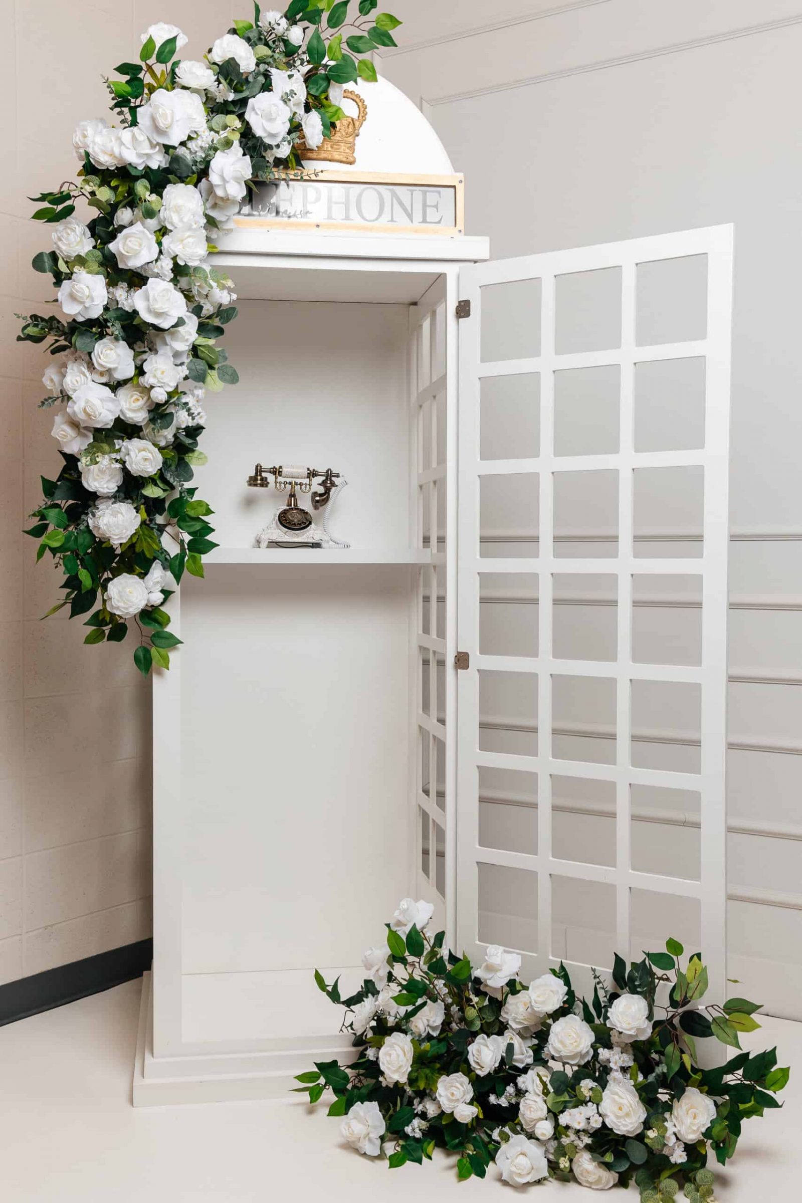 The floral arrangement next to the Audio Guestbook Telephone Booth adds a touch of elegance and sophistication, creating a visually stunning focal point for any event. Designed to complement the vintage charm of the telephone booth, these carefully selected flowers enhance the overall aesthetic, making it an inviting space for guests to leave their heartfelt messages. The soft, natural accents blend seamlessly into wedding receptions, corporate events, and upscale celebrations, elevating the ambiance with timeless beauty. Whether used as a decorative statement or to match an event’s color scheme, the floral decor enhances both the functionality and visual appeal of the guestbook experience.